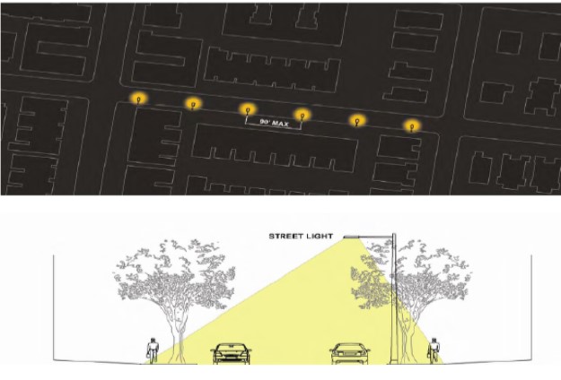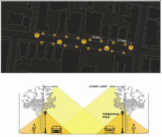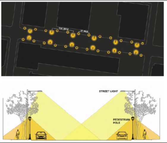 עבור רחובות ראשיים הוחלט להחליף את עמודי התאורה הקיימים מסוג ראש-קוברה, בעמודים חדשים הנקראים Brown Round, ובנוסף להם עמודי תאורה נוספים המיועדים עבור הולכי רגל. עוד נקבע כי בכל מקום שבו הדבר יתאפשר, תינתן עדיפות להתקנת זוג עמודים שיאירו בעוצמה נמוכה, כחלופה להתקנת עמוד אחד שיהמם את העוברים ושבים בעוצמת אור חזקה.